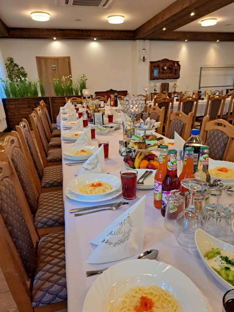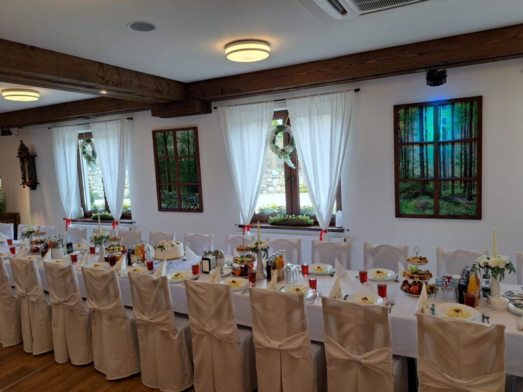 Nasze jasne i przestronne wnętrza mogą być tłem dla wszelkiego typu imprez, od urodzin poprzez imieniny, chrzciny, komunie, osiemnastki, stypy, obrony magisterskie, doktorskie aż do wystawnych bankietów, konferencji, imprez firmowych czy kameralnych wesel.